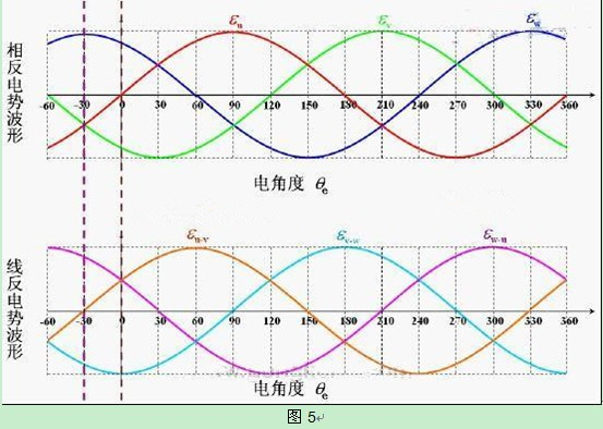 上述兩種轉(zhuǎn)子定向方法對應(yīng)的繞組相反電勢波形和線反電勢,以及電角度的關(guān)系如下圖所示,棕色線為a軸或α軸與d軸對齊,即直接對齊到電角度0點(diǎn),紫色線為a軸或α軸對齊到與d差(負(fù))30度的電角度位置,即對齊到-30度電角度點(diǎn):