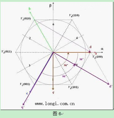 d、q軸矢量與a、b、c軸或α、β軸之間的角度的關(guān)系如下圖所示,棕色線d軸與a軸或α軸對齊,即直接對齊到電角度0點(diǎn),紫色線為d‘軸與a軸或α軸相差30度,即對齊到-30度電角度點(diǎn):